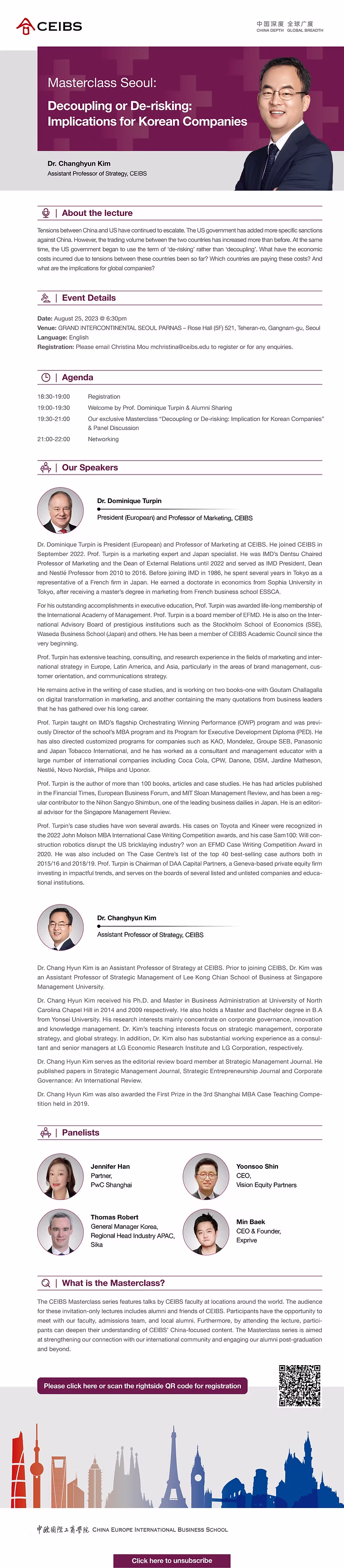 Updated: Aug 25, 2023CEIBS Masterclass Seoul: "Decoupling or De-risking: Implication for Korean Companies" by CEIBS Professor Changhyun Kim