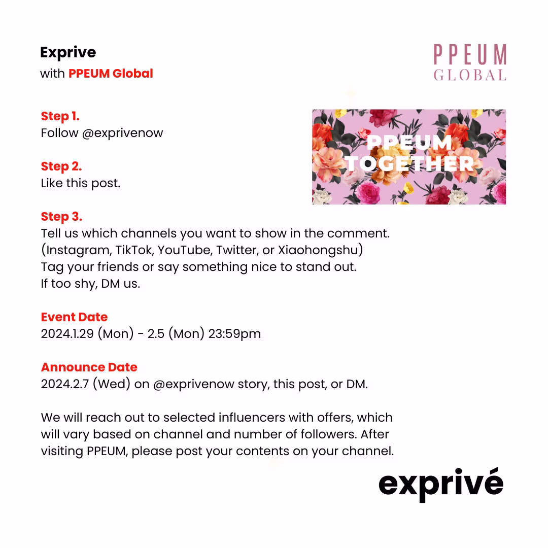 We will reach out to selected influencers with offers, which will vary based on channel and number of followers. After visiting PPEUM, please post your contents on your channel.